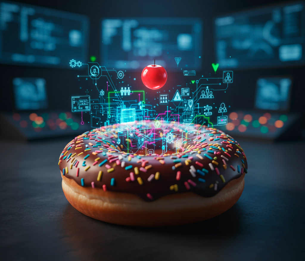 Imaginemos una tarta, en el centro hay una gran guinda (la guinda del pastel). Esta guinda es la tecnología, el hardware o el software que hayamos escogido para resolver la aplicación. Ahora recortamos la parte que se corresponde con la guinda y la retiramos. Nos queda un donut.